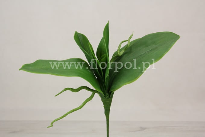 wys 30cm, liść 18cm; Sztuczne ulistnienie z imitacją korzeni do storczyka. Siedem gumowych liści z drucikiem ułatwiającym kształtowanie.