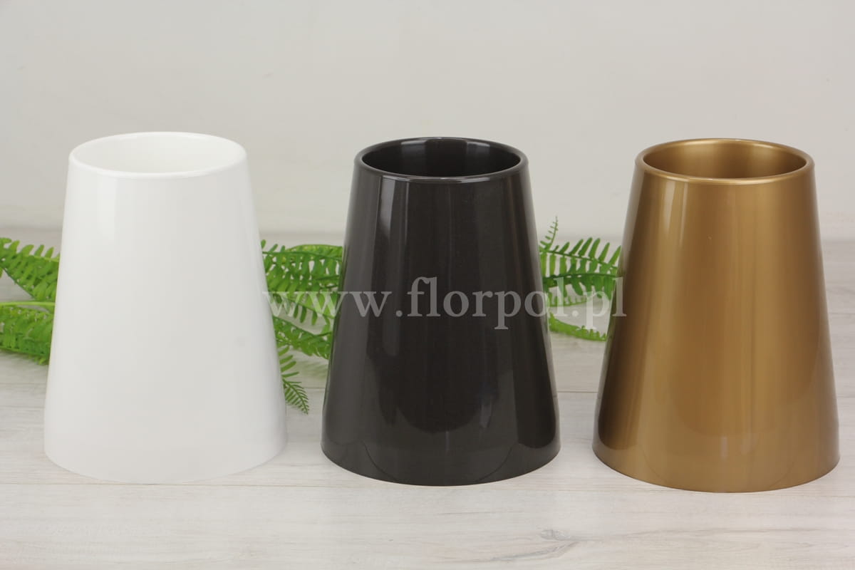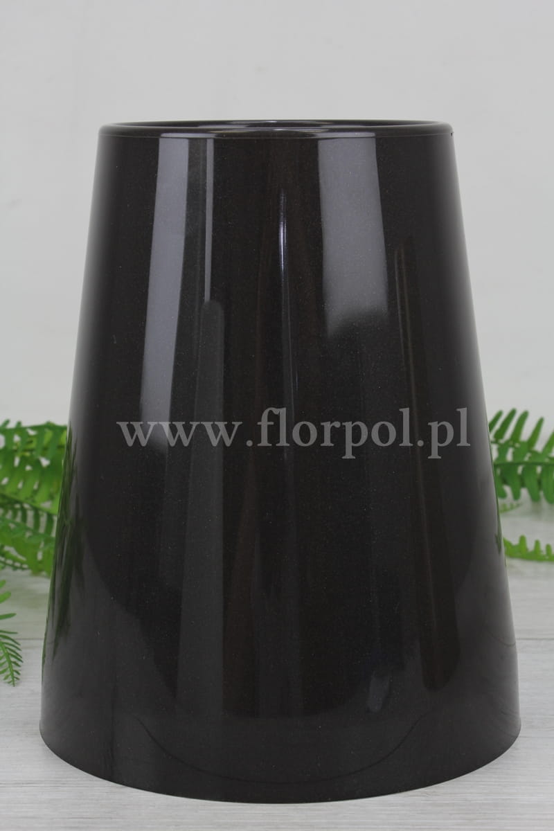 wym zewnętrzne: wys 20,5cm, śr góra 11,5cm, śr dół 16,5cm; Wym wewnętrzne: śr 10cm, gł 16cm; Nowoczesna odsłona cmentarnych flakonów – prosta, a zarazem bardzo elegancka forma pasująca do każdego rodzaju nagrobnej płyty. Podstawa flakonu idealnie rozszerzona aby zapewnić stabilność. Istnieje możliwość umieszczenia wewnątrz małego wkładu do gazonów.