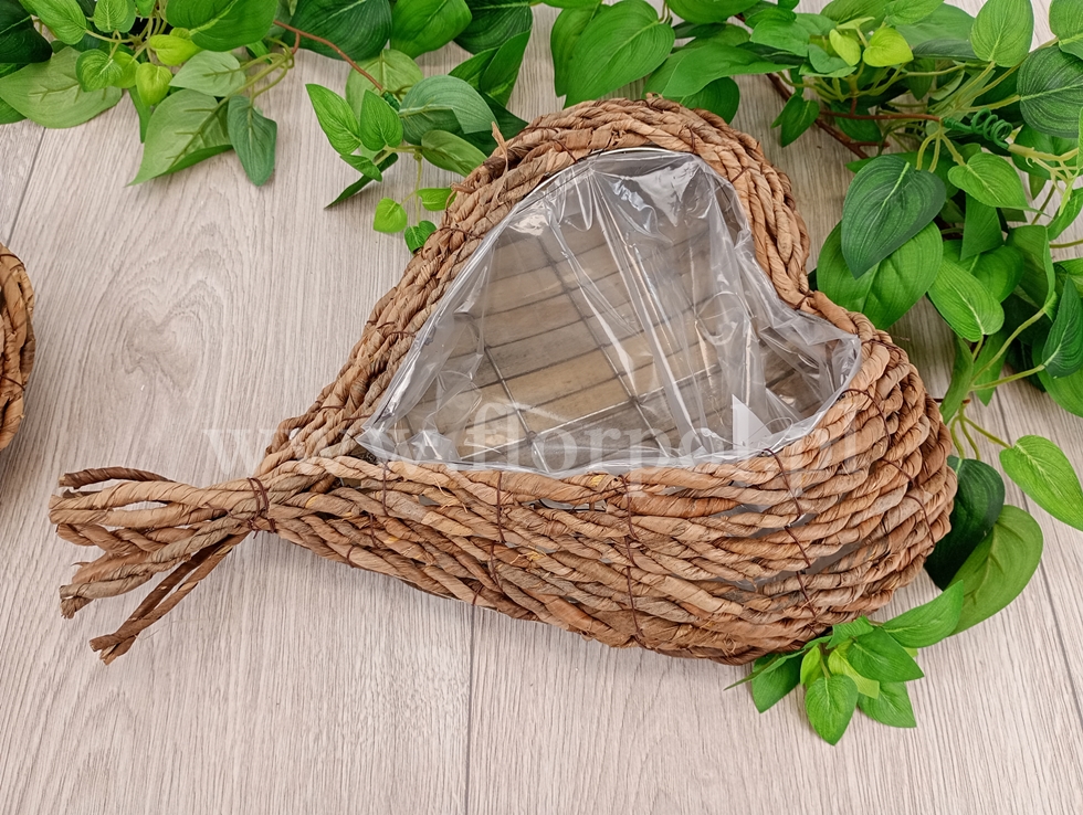 Wysokość 30 cm, szerokość 33 cm; bardzo ładna, niezwykle ciekawa baza do niewielkiej kompozycji florystycznej w kształcie serduszka. Metalowy stelaż pokryty sznurkami ze skręcanej suszonej trawy.